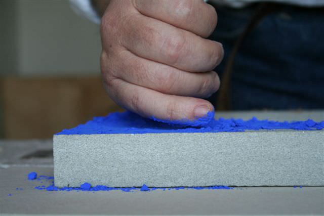 Known for his monochromes, Fratteggiani Bianchi focuses on color, which is applied by hand in the form of powdered pigment, without the use of adhesives, on the serena stone. This particular innovation creates a particularly intense luministic and chromatic effect.