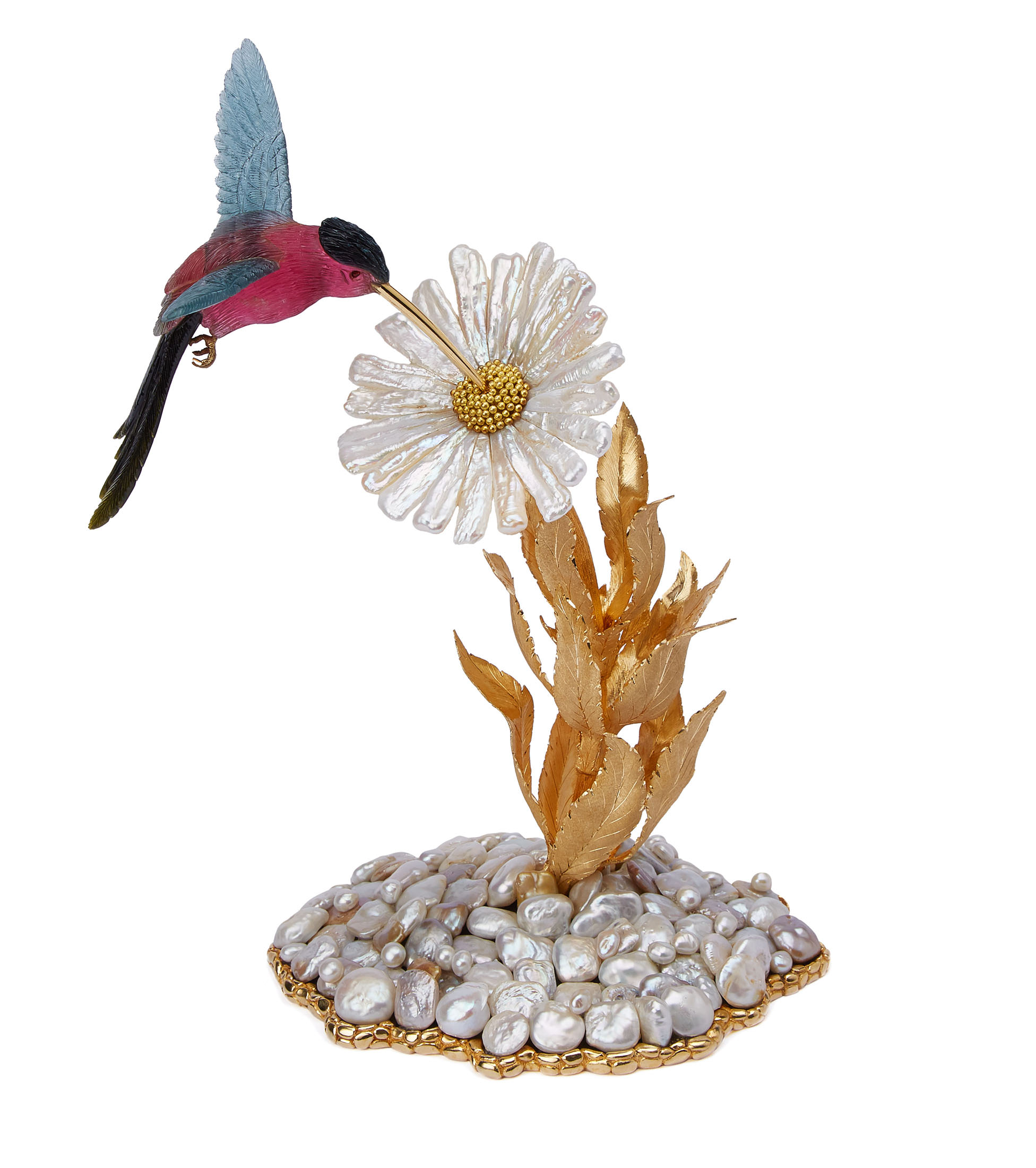 Gianmaria Buccellati 2009. Creazione ornamentale raffigurante un Colibrì in tormalina multicolore con fiore margherita a petali in perle Biwa foglie in oro e base con perle barocche.
